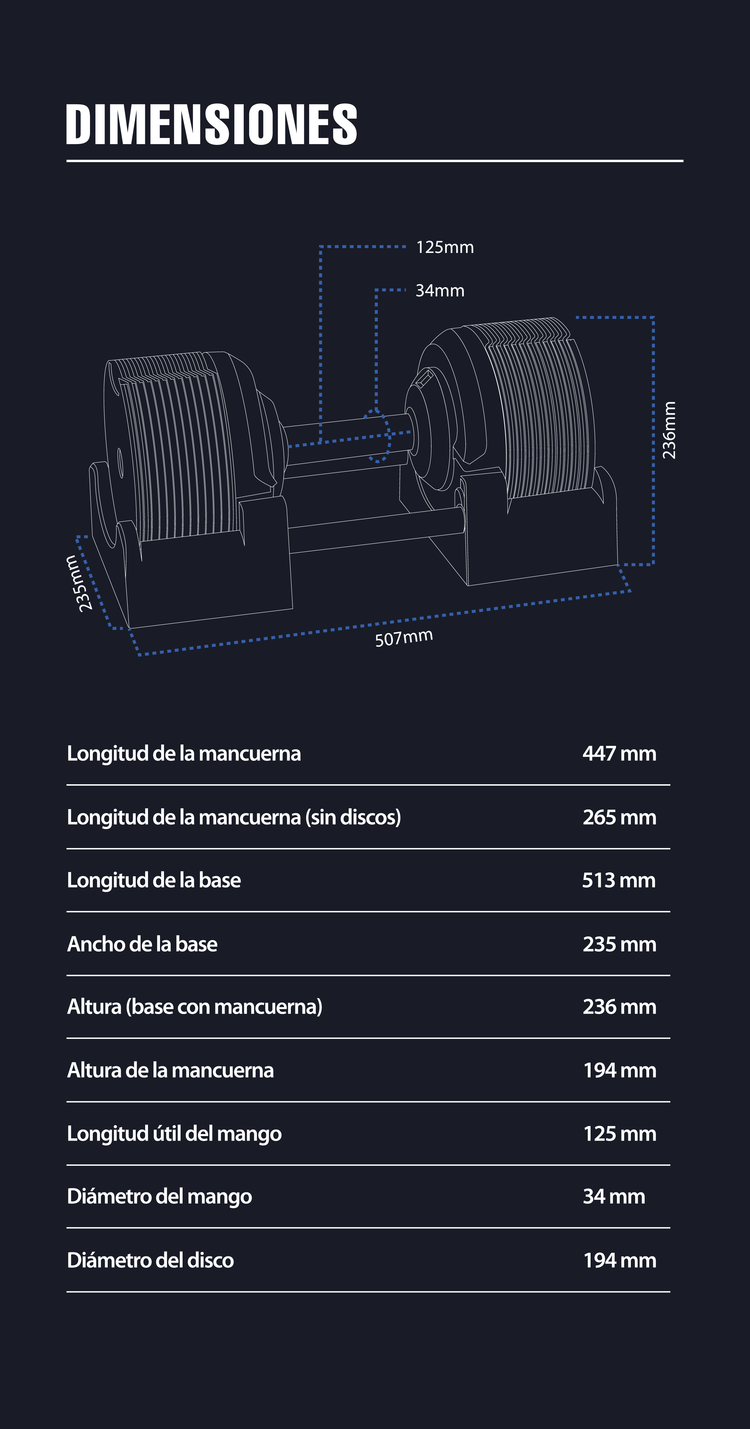 Ya sea que busques ganar fuerza o mantenerla, este es el sistema de mancuernas todo en uno definitivo, creado para ofrecer eficiencia, ahorro de espacio y resultados.